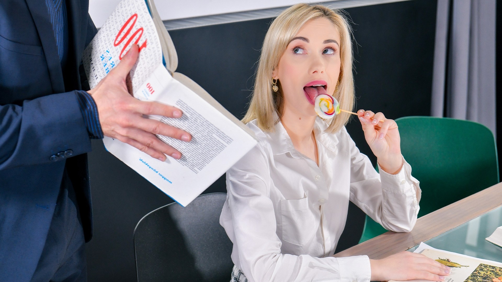 La tentación tiene un nombre, Sky Pierce y hoy viene a www.penthousegold.com disfrazada de colegiala dispuesta a demostrarlo. Miradla armada de un consolador y masturbándose, luciendo su perfecta figura esperando la llegada de Erik Everhard, su profesor particular, cuyas lecciones son aburridas pero le excita tanto que mientras recita la lección no deja de lamer su piruleta imaginándose que es otra cosa lo que lame. Hoy ha decidido ir más allá y cuando ha puesto la piruleta en su coñito rasurado éste no ha podido si no devorarlo para luego follársela ahí mismo, sobre la mesa para poco después llevarse una buena mamada de arcada y seguir recibiendo embestidas en un polvazo épico que ha culminado con una corrida facial.
